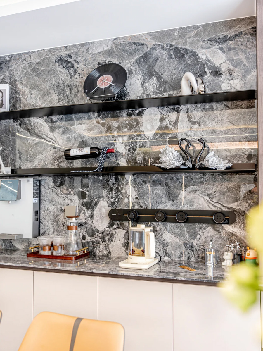 背板小心机:大块花纹岩板打底,低调奢华,细节感直接拉满!