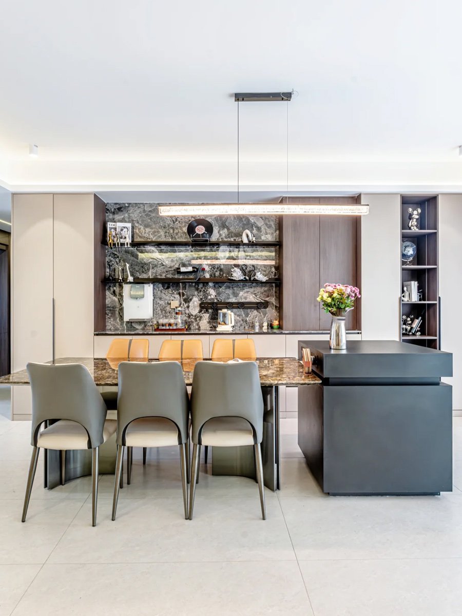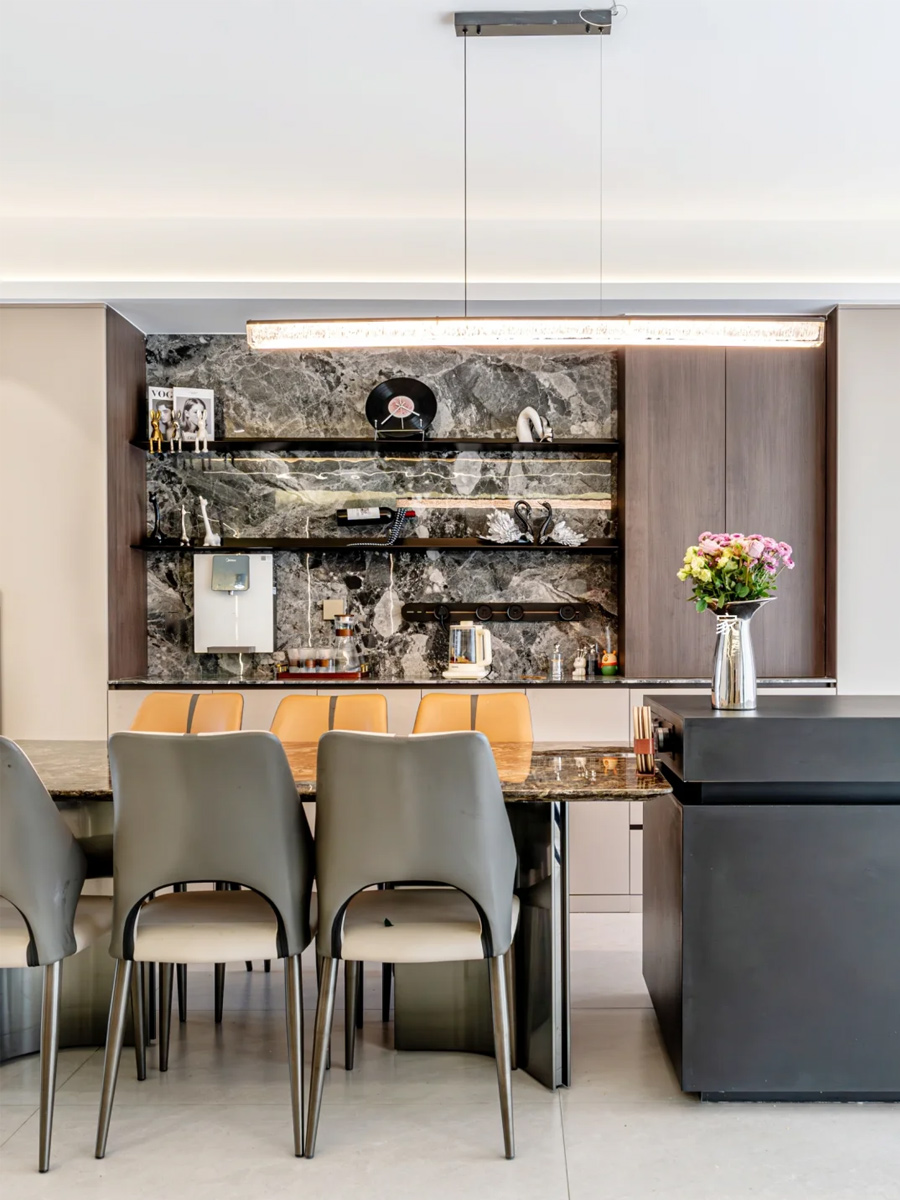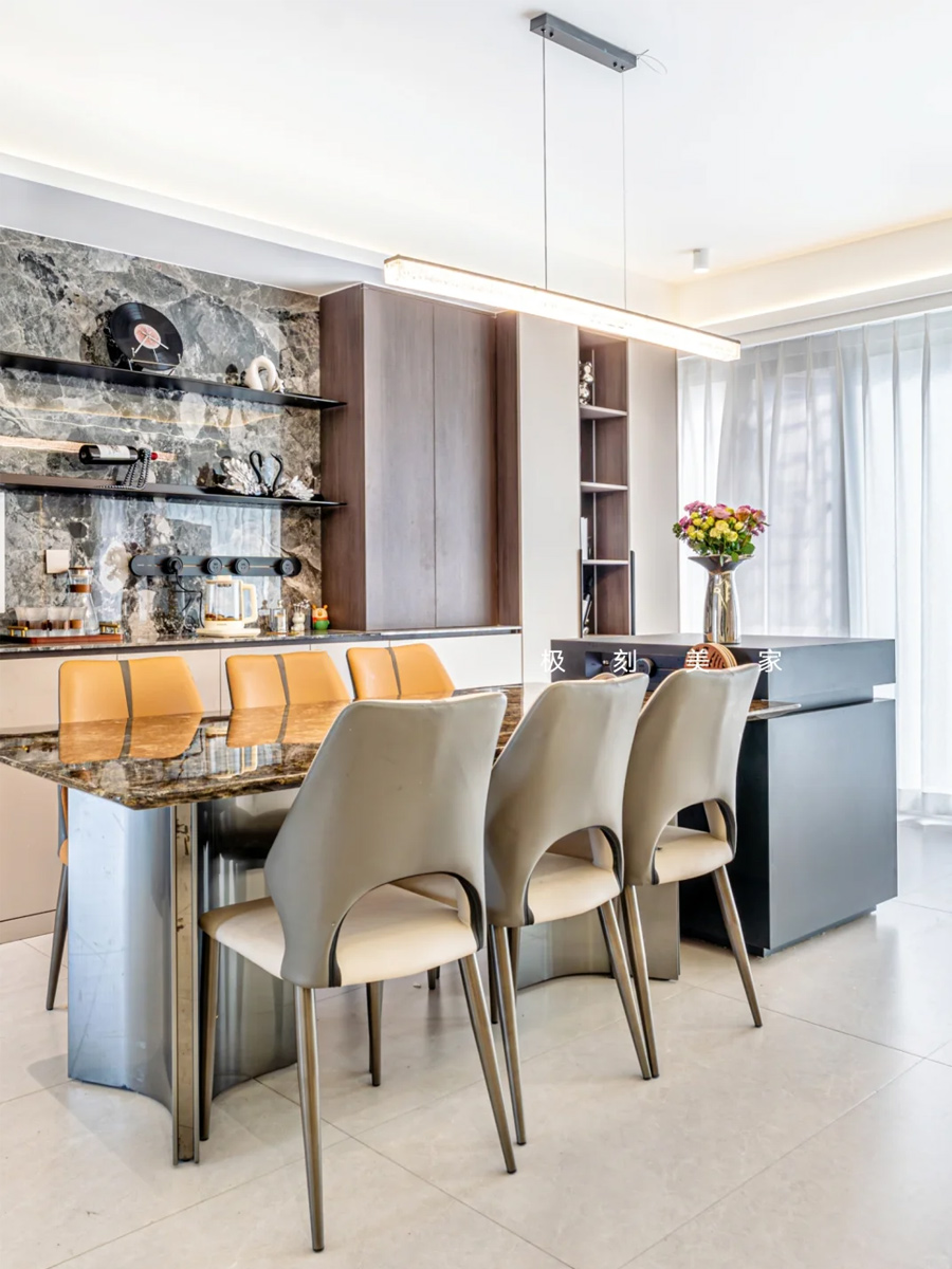 岛台和餐桌一体设计,材质和颜色与餐边柜呼应,整体感!岩板餐桌不仅颜值高,还耐刮耐磨,日常使用完全不用担心~