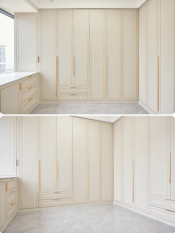 门墙柜一体化,象牙灰柜门镶嵌金属边框,与柜门同款式,尤加利护墙板同色配套房门柜体更显精致统一
