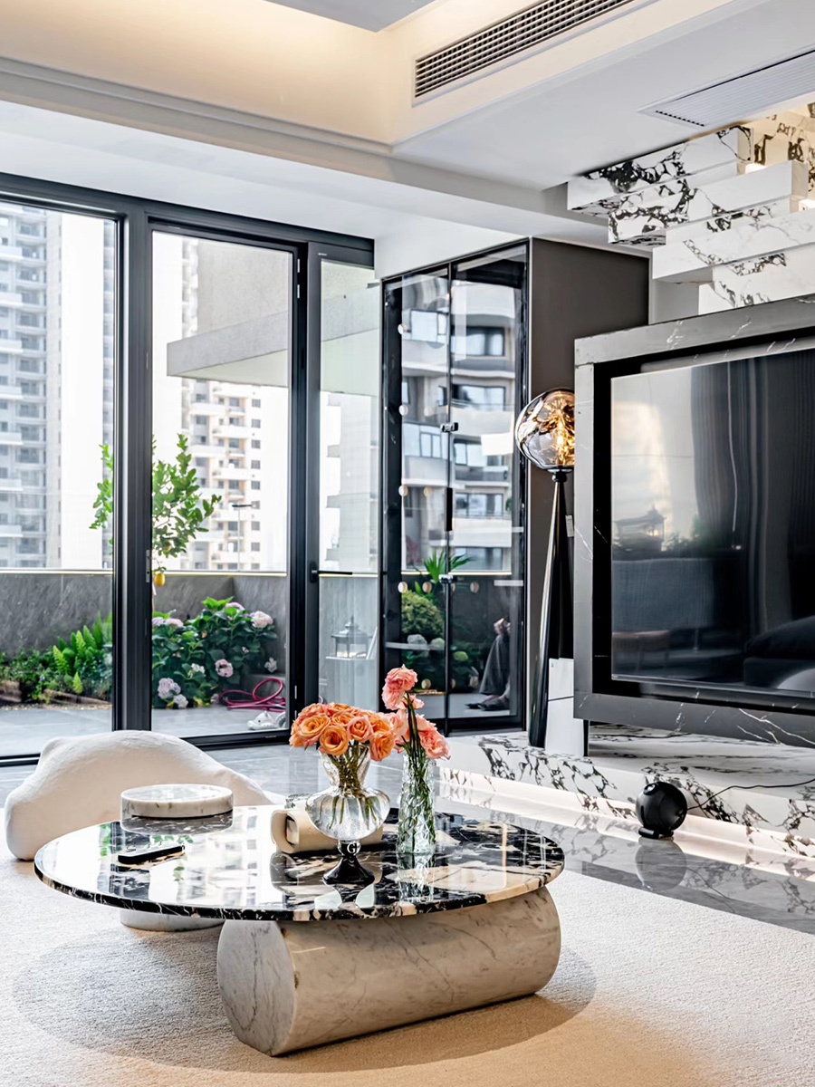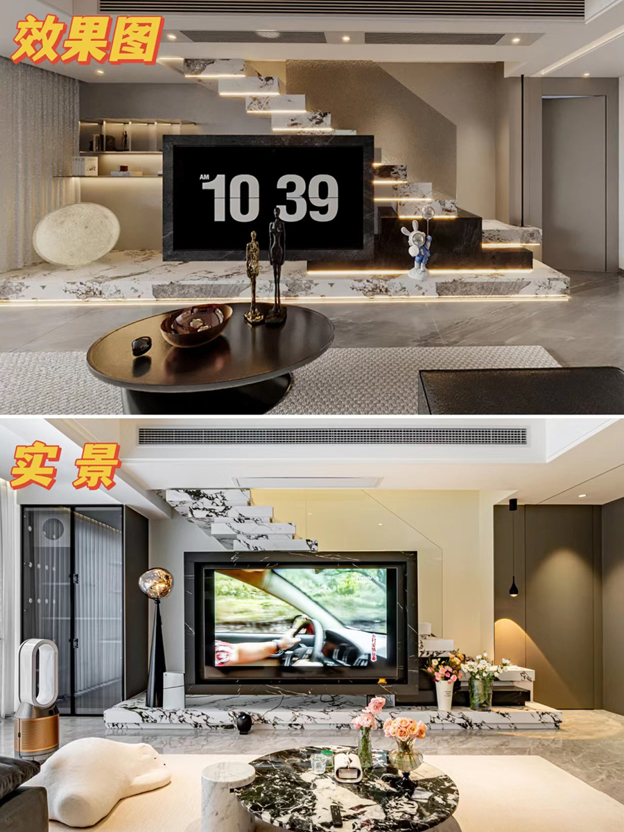 一字型岩板叠步楼梯+电视背景墙一体,仿佛置身杂志拍摄现场。