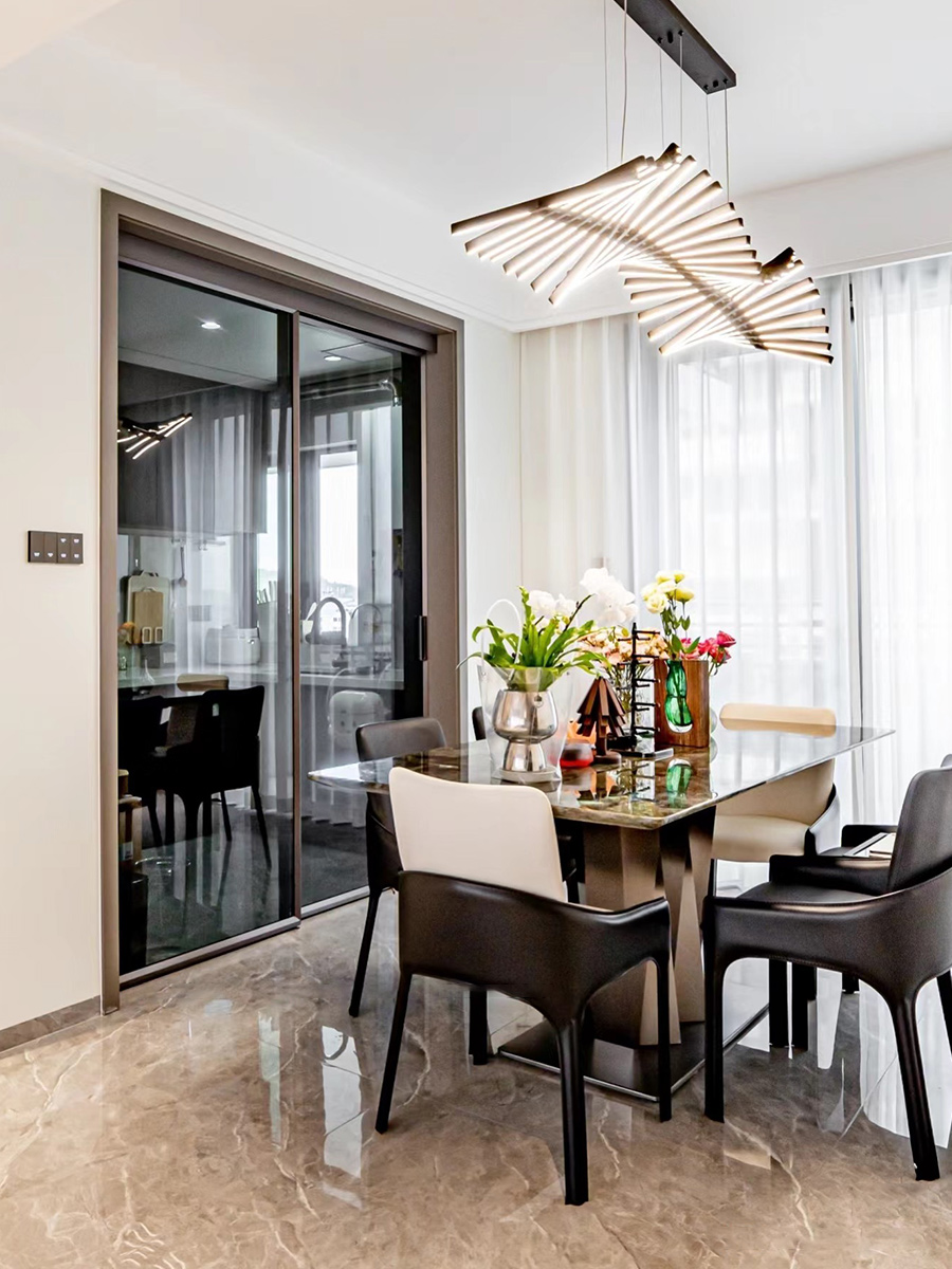 客厅、餐厅、生活阳台联通,全开放的公共区域在视觉更宽阔,动线上也非常便利。