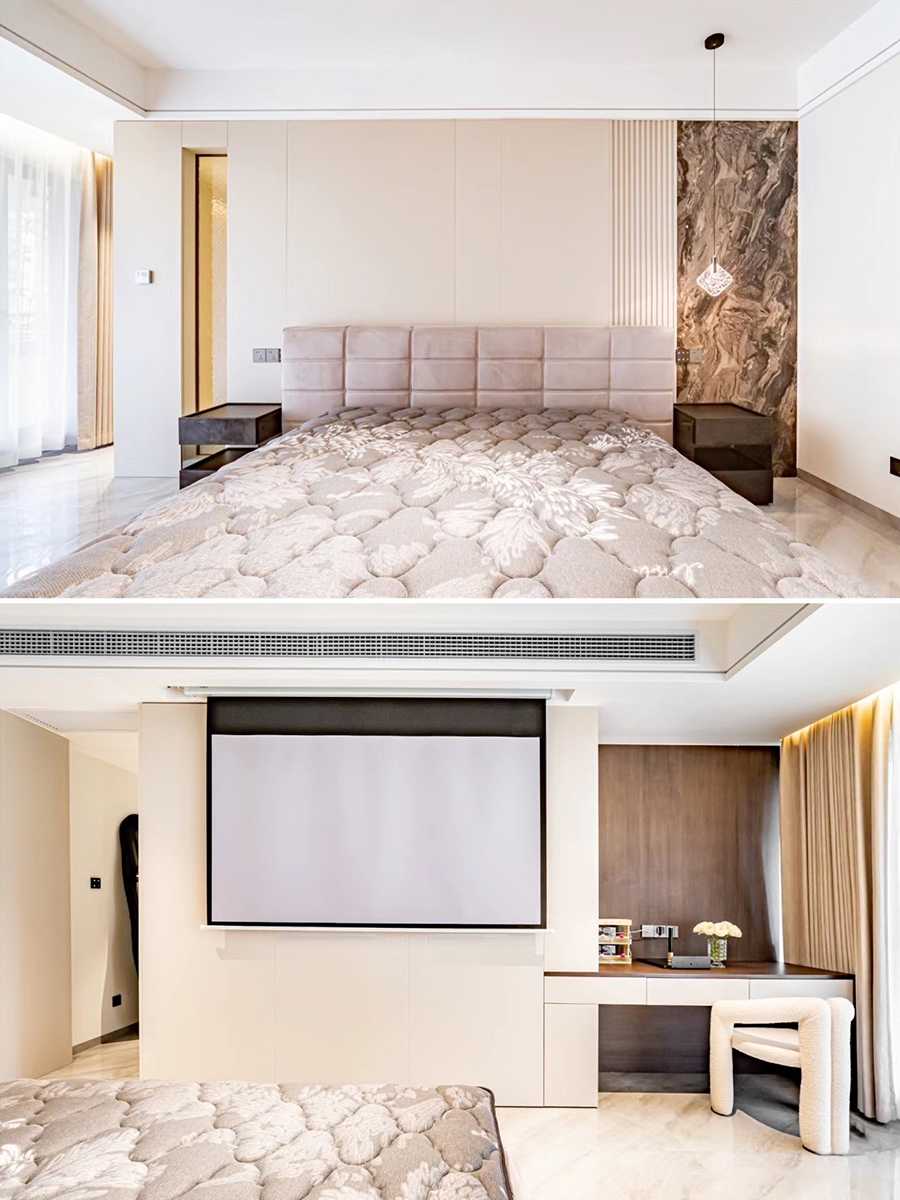 主卧做套房设计,利用衣帽间做隔墙,一边做隐藏投影,穿插式一字型梳妆台。