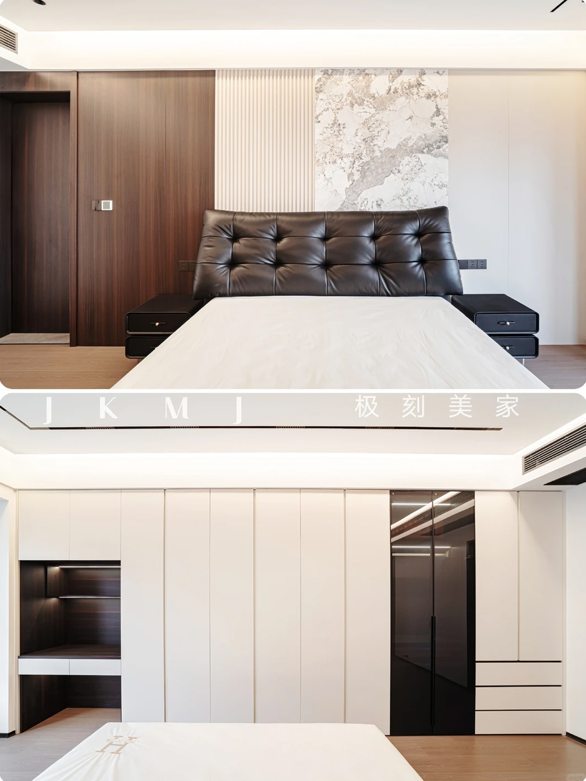 卧室:床头背景墙岩板+格栅凸显档次、床品注重高品质面料、床尾整排定制柜、灯光需柔和温馨。